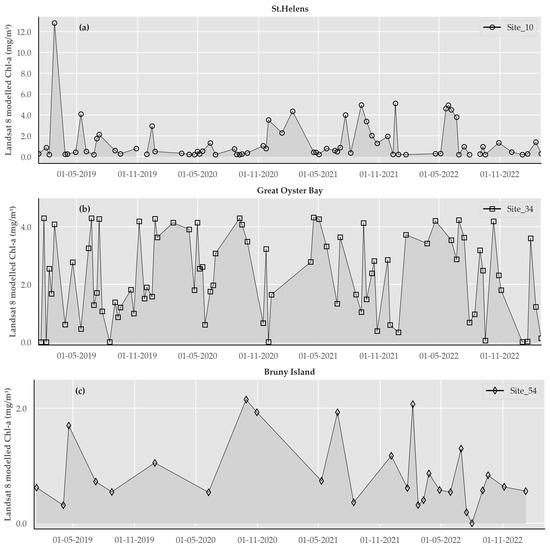 Time-series graph of surface chlorophyll a estimates between 2019 and 2023, using the automated GEE model. Each point symbolises a pixel value extracted at a field survey location (Figure 2) at site 10 for St. Helens (a), site 34 for Great Oyster Bay (b) and site 54 for Bruny Island (c).