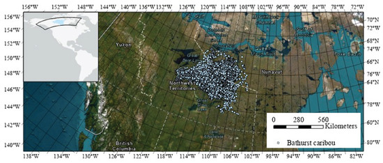 Figure 1). In spring, they migrate to traditional calving grounds in the tundra southwest of the Bathurst Inlet near Canada’s northern coast (66.8°N, 109.5°W) (