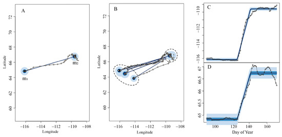 21]. The mean process describes the range shift and is specified by the central locations, times (i.e., beginning and duration of migration), and ranging area of movement events. The mean process