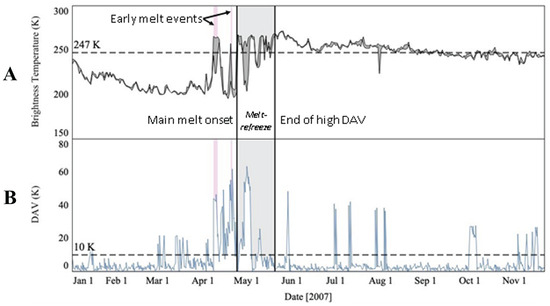 21]. Melt onset, brief early melt events, and melt duration are evaluated using the melt onset detection algorithm, which is a function of passive microwave brightness temperature and diurnal amplitude variations (DAVs) [