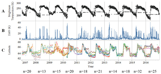 (B), and the latitudinal component of the migration (C) to show the overall synchroneity of the big shifts. Relationships between the passive microwave and caribou datasets were analyzed by comparing the output from each dataset.