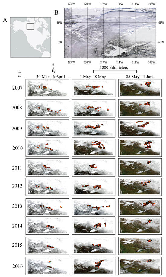 We used MODIS true color imagery at 500 m resolution to capture landscape conditions at the beginning of each month within the Bathurst caribou migratory period (1 April–1 June). We selected 8-day composites for three defined time intervals (30 March–6 April, 1–8 May, and 25 May–1 June) each year and overlaid the overlapping caribou location data during those time intervals. This analysis was performed in ArcGIS Pro version 2.9.4. In