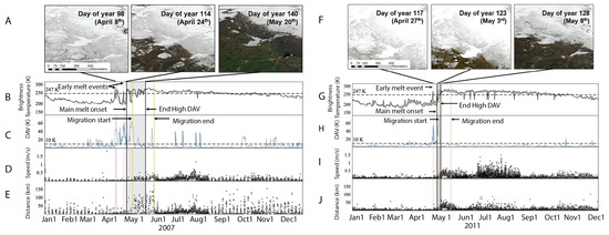 Individual female caribou in the Bathurst herd showed relatively low activity with respect to displacement rate and distance prior to the start of their spring migration. The displacement rate increased rapidly following main melt onset, and the initiation of this increase in activity overlapped with peak values in . The female caribou departed shortly after main melt onset events in both cases, but the duration, displacement rate, and total daily distances of their migrations differed significantly. In 2007, the migration duration was approximately 33 days, while the migration duration in 2011 was approximately 16 days. Female caribou appeared to move relatively longer distances at a slower rate during spring migration in 2007 when compared to 2011. Following the calving season, there were multiple instances in which the brightness temperature and signals fluctuated dramatically and appeared to be in synchrony with the distance and displacement rate traveled by the herd during these intervals. This was particularly the case in 2011, which appeared to have multiple dramatic fluctuations in brightness temperature and starting at day 180 (29 June) and ending at day 225 (13 August). During this time, there was a sudden increase in female caribou distance and speed. This was also the case in 2007 on day 210 (29 July), when there was a sudden brief increase in DAV, as well as caribou distance and displacement rate. The snow coverage seemed to be much larger and prolonged during the migration period in 2011 than it was in 2007 as suggested by the frequent early melt events in 2007 compared to 2011.