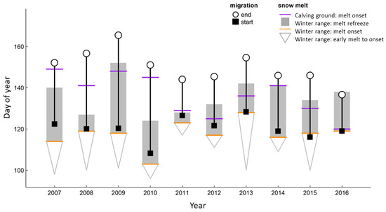 22], the arrival time at calving grounds appears to be driven largely by the physiological need to arrive in time to calve and is less influenced by weather conditions en route.