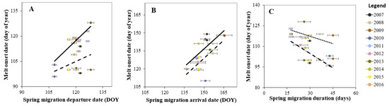 Relationships between migration timing and early onset of melting were not statistically significant (