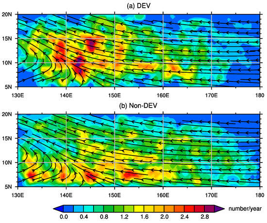 Track density (number of occurrences per year per 1° × 1° latitude–longitude grid box) of (a) the developing and (b) non-developing tropical disturbances, as well as climatological mean 850 hPa streamline, during June–November of 2000–2019 over the WNP.