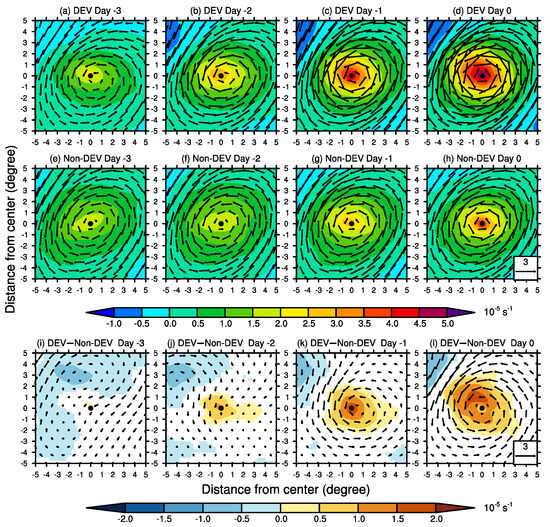 Figure 14 presents the temperature anomalies in the two groups of disturbances and their differences. The developing disturbances exhibit significantly stronger upper-level warm cores on day −3 than non-developing cases (Figure 14a,e,i), which is consistent with previous studies based on field campaign observations [57], and the warm-core strength gradually increases from day −3 to 0 (Figure 14a–d), which is related to the latent heat release associated with precipitation, e.g., [44,65]. The warm-core structure can excite the primary and secondary circulations and promote the development of disturbances [33], according to the Sawyer–Eliassen equation [70,71,72]. However, the non-developing disturbances do not exhibit the prominent enhancement of temperature anomalies (Figure 14e–h).