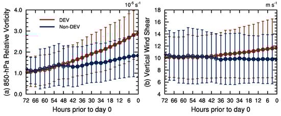 Time series of area-averaged (a) 3–8-day-filtered 850 hPa relative vorticity (10−5 s−1) within 2° of the disturbance centers and (b) 20-day low-pass filtered 200–850 hPa vertical wind shear (m s–1) within 2°–8° of the disturbance center for the developing (red) and non-developing (blue) disturbances. The bars denote standard deviations. The filled markers represent significant differences between two groups of disturbances at the 95% confidence level based on a t test.