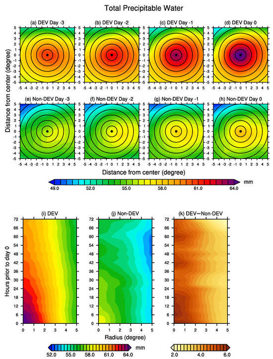 Figure 4 presents the composites of TPW and the corresponding radius–time Hovmöller plots for the two groups of disturbances as well as their differences. The developing cases exhibit a more axisymmetric moist-core structure, with a notable increase in TPW with time (Figure 4a–d,i). The initial TPW near the center is over 60 mm (Figure 4a), which is much higher than the moist tropical mean of 51.5 mm [56]. Then, the inner-core TPW continues to increase. On day −1, TPW in the whole inner-core region exceeds 60 mm (Figure 4c). The high TPW is favorable for TC genesis because it can promote convection and protect the disturbance core from dry air intrusion, e.g., [33]. However, the non-developing disturbances exhibit a small increasing tendency associated with dry air transport from the north (Figure 4e–h,j). TPW in both the inner core and outer core of the developing disturbances is significantly higher than the non-developing cases during the 3-day pre-genesis stage (Figure 4k).