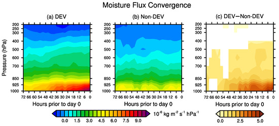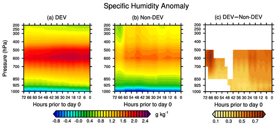Figure 5 shows the temporal evolution of the vertical profile of specific humidity anomalies averaged in a 10° × 10° box and centered at two groups of disturbances and their differences. The significantly higher TPW for the developing disturbances (Figure 4k) is mainly attributed to the significantly higher mid-level moisture (Figure 5a,c), which is consistent with previous studies [37,57]. High mid-level humidity acts to reduce the strength of convective downdrafts and results in strong low-level convergence and spin-up [58,59].