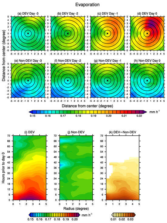Figure 6 shows the composite evaporation for the developing and non-developing disturbances as well as the corresponding radius–time Hovmöller plots and their differences. Initially, the two groups of disturbances show similar levels of evaporation (Figure 6a,e), and no significant differences exist on day −3 (Figure 6k). From day −2 to 0, evaporation of the developing disturbances obviously intensifies, and its maximum in the northeast quadrant begins to shrink inward, associated with an outward negative radial gradient (Figure 6b–d), and the differences from the non-developing disturbances become significant (Figure 6k). In comparison, the evaporation of the non-developing cases shows no clear tendency, and there is no prominent negative radial gradient during the 3 days. The negative radial gradient of evaporation necessary for TC genesis is consistent with previous studies [40,41,42]. It should be noted that, despite the statistically significant difference in evaporation between the two groups, its magnitude is relatively modest, remaining below 1 mm on day−1, even on day 0. Despite its modest magnitude, evaporation plays a crucial role in moistening the column when inner-core convection is inactive [35].