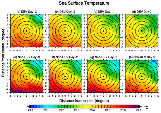 As shown in Equation (4), evaporation is proportional to SST and surface wind speed [54], which are then analyzed to examine what dominates the evolution of evaporation. Figure 7 shows the composites of SST for the developing and non-developing disturbances. SST shows a “southwest high−northeast low” spatial pattern for both groups of disturbances, with modest variations (Figure 7a–h) and no significant differences during the 3 days. SSTs surrounding the centers of two groups of disturbances are above 29 °C, which is much higher than the threshold of 26 °C for TC genesis [6]. The evolution features indicate that SST does not dominate the spatiotemporal evolution of evaporation.