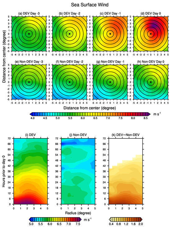 Figure 8 shows the composites of surface wind speed for the developing and non-developing disturbances and their differences. On day −3, although the developing disturbances show slightly higher surface wind speeds than the non-developing cases (Figure 8a,e,i,j), there are no significant differences between them (Figure 8k). The surface wind of the non-developing disturbances grows slowly afterward (Figure 8f–h,j), while the surface wind of the developing cases markedly intensifies from day −2 to 0, with a prominent inward propagation of the maximum, which results in a negative radial gradient in the outer core (Figure 8b–d,k). This increase in surface wind speed almost synchronizes with the increase in evaporation, and they have similar spatial variation characteristics, suggesting that surface wind speed dominates the evolution of evaporation.