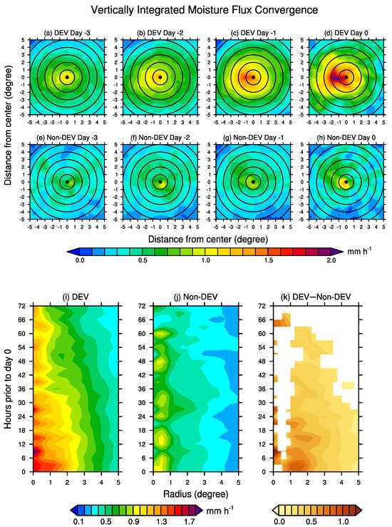 The evolution of VIMFC in the inner core of the developing disturbances can be divided into two stages. From −72 h to −36 h, the change in the inner-core VIMFC is negligible, while it shows a significant increase starting from −36 h (Figure 10i), which is attributed to a rapid enhancement of moisture flux convergence in the lower troposphere (Figure 11a). Note that this is almost simultaneous with the increase in surface wind speed (Figure 8i), indicating that the strengthening of the cyclonic circulation in the middle to lower troposphere (i.e., a coherent enhancement of the deep-layer vorticity) results in the intensification of moisture flux convergence. In contrast, the VIMFC of the non-developing disturbances does not change much over the 3 days (Figure 10j) due to insufficient moistening (Figure 5b) and weak convergence (Figure 12b) in the middle-to-lower troposphere. The difference in inner-core VIMFC between the two groups of disturbances reaches over 1 mm h−1 on days −1 and 0 (Figure 10k).