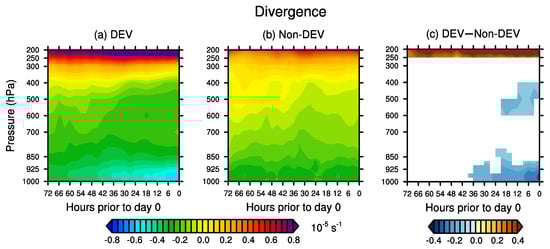 Figure 10 shows the composite VIMFC of the developing and non-developing disturbances and their differences. The temporal evolutions of the vertical profile of moisture flux convergence and divergence were averaged in a 10° × 10° box, and their differences are shown in Figure 11 and Figure 12, respectively. Although the two groups of disturbances have similar initial low-level relative vorticity (Figure 2), the developing disturbances show stronger VIMFC on day −3, with a noticeable maximum in the inner core (Figure 10a). Compared to the non-developing disturbances, the developing disturbances always have a significantly stronger VIMFC from day −3 to 0 (Figure 10k); the associated water vapor transport to the disturbance center is more conducive to promoting moist convection. The significantly stronger mid- to lower-level moisture flux convergence on day −3 (Figure 11c) is mainly attributed to significantly higher mid-to-lower level specific humidity (Figure 5c), and stronger mid- to- lower -level specific humidity (Figure 5c) and convergence (Figure 12c) jointly contribute to significantly stronger mid-to-lower level moisture flux convergence from day −2 to −1 (Figure 11c). Additionally, the developing disturbances exhibit significantly stronger divergence at 200 hPa (Figure 12c) and a higher and more abrupt shift from convergence to divergence (Figure 12a–b) than the non-developing disturbances, which may be attributed to the potential influences from upper-level systems, such as the tropical upper-tropospheric trough [61] and tropical easterly jet [62]. In summer, the warm water in the WNP was located just west of the tropical upper-tropospheric trough and near the entrance region of the upper-tropospheric tropical easterly jet. These features can contribute to a large-scale upper-level divergence, which is favorable for TC genesis [63]. Further investigation is needed to explore the effects of upper-level systems on the development of tropical disturbances.