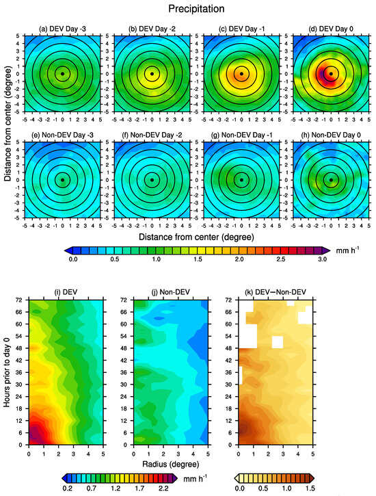 Figure 13 depicts the composite precipitation of the developing and non-developing disturbances and their differences. The spatiotemporal variation in precipitation is similar to VIMFC, with the maximum slightly deviating from the disturbance center, possibly due to the influence of vertical wind shear, e.g., [64,65,66]. During the three days prior to TC genesis, the developing disturbances exhibited a broader coverage of precipitation with significantly higher intensity compared to the non-developing cases (Figure 13a–c,k). Stratiform precipitation may be responsible for the broad coverage of precipitation in the ambient region of the developing disturbances in the pre-genesis stage [30,44]. Precipitation of the developing disturbances (especially in the inner core) gradually intensifies over the three days (Figure 13a–c,i), almost simultaneously with VIMFC (Figure 10a–c,i). On day −1, the inner-core precipitation appears to intensify markedly, possibly because TPW reaches a certain threshold (Figure 4i), as proposed in previous studies [38,67,68,69]. In contrast, the precipitation of the developing disturbances in the outer core region is relatively weak. This reflects the enhancement of low-level vorticity, the contraction of the wind field, and the continuous concentration of convection towards the disturbance center approaching TC genesis. The non-developing disturbances have much weaker initial precipitation, with no significant intensification during the three days (Figure 13e–h,j). The difference in inner-core precipitation between the two groups of disturbances approaches 1.5 mm h–1 on day −1 and 0 (Figure 13k).