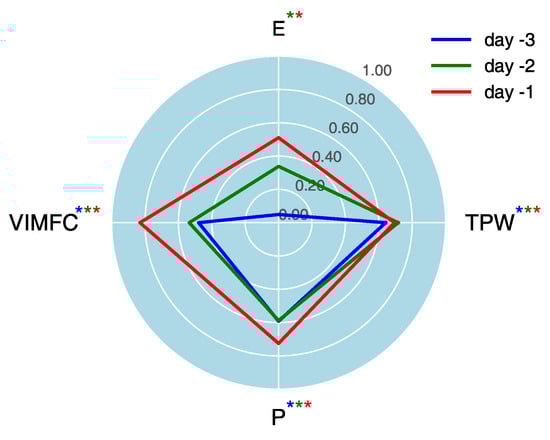 BDI of water vapor budget components averaged in 10° × 10° boxes on days −3 (blue), −2 (green), and −1 (red). E and P represent evaporation and precipitation, respectively. The asterisks in corresponding colors beside each parameter denote significant differences between the developing and non-developing disturbances at the 95% confidence level based on a t test.