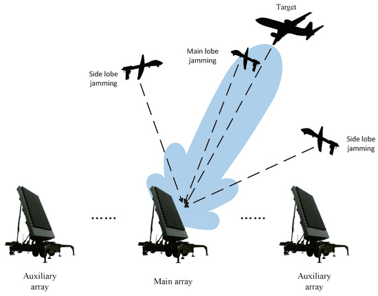 - Yang, X.; Yin, P.; Zeng, T.; Sarkar, T.K. Applying Auxiliary Array to Suppress Mainlobe Interference for Ground-Based Radar. IEEE Antennas Wirel. Propag. Lett. 2013, 12, 433–436. [Google Scholar] [CrossRef]