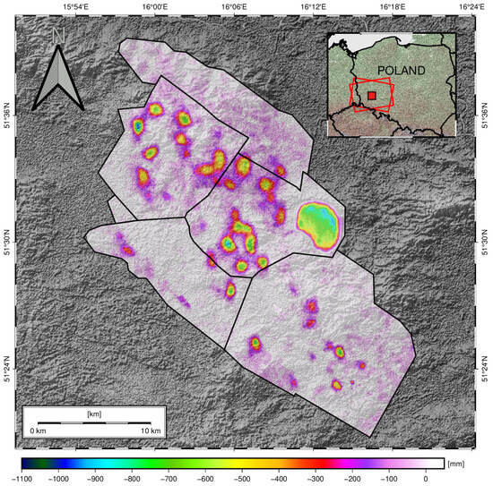 Monitoring the effects of mining activity on the ground surface is a key issue in mining site protection. Ground surface subsidence may be particularly dangerous in urban areas, where it may pose a threat to both the ground-level and underground infrastructure [1,2]. Underground mining exploitation causes voids to be created in the rock mass. Some of these voids are then filled by the rock masses that move due to gravity, leading to the development of deformations on the ground surface. A number of surveying methods are used to determine the extent and magnitude of subsidence caused by mining. Among the most important are classical surveying methods such as precise leveling [3,4] and global navigation satellite systems (GNSS) [5,6,7]. At the same time, in the last decade, remote sensing and photogrammetric methods have been increasingly used. The literature contains numerous studies on the use of unmanned aerial vehicles (UAVs) [8,9,10], laser scanning: ground [11,12] and airborne [13,14], and methods for processing satellite radar data. According to the authors, SAR time series methods, such as the persistent scatterer interferometric (PSI) method [15,16,17,18], small baseline subset (SBAS) method [4,19,20], offset-tracking method (OTM) [21,22], and, to a more limited extent, ground-based radar interferometry [23,24], are particularly noteworthy. Remote sensing ground observation techniques are characterized by high data acquisition rates, which are often several days or even less. Spatial resolution is another important consideration in selecting optimal surface monitoring solutions. In the case of SAR data, it is also not insignificant that this type of data provides the opportunity to observe the Earth’s surface regardless of the time of day and weather conditions.