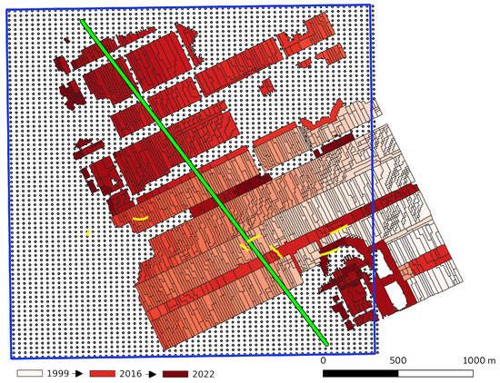 Location of the study area: red marks the boundaries of the area, the gray dots represent the the results array of SBAS time series calculations, and the exploited deposit is marked with gray polygons. The green line shows the path of the geological profile, and and the yellow lines represent local tectonic dislocations.