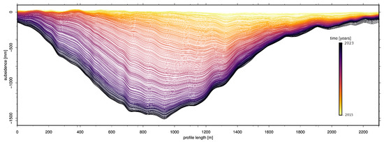 Results of SAR data calculations using the SBAS method–cumulative subsidence of the ground surface along the profile marked in Figure 3; the results cover the period from November 2014 to December 2022.