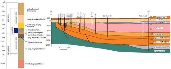 (Left): Lithological profile of the Fore–Sudetic Monocline copper ore deposit and (right): geological cross-section through copper ore deposits in the Fore–Sudetic Monocline (adapted from [55]).