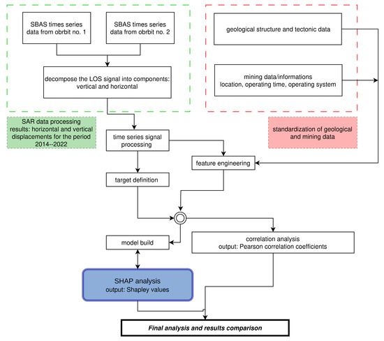 The flow chart of the proposed methodology for analyzing the significance of geological-mining parameters using the SHAP method supported by SBAS series.