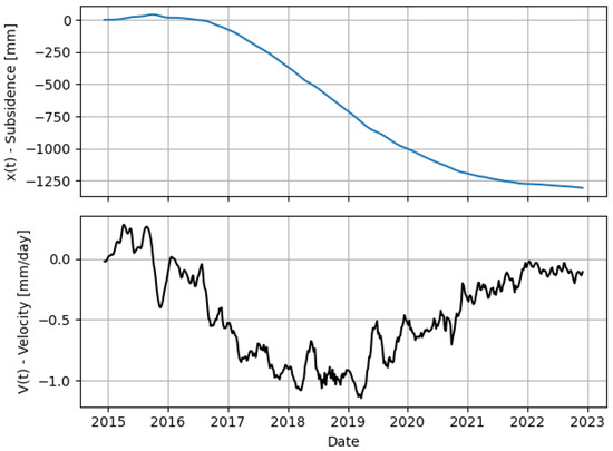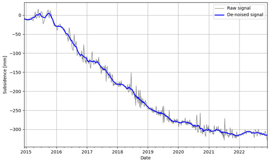 The first step was to process the SAR data from the two independent paths into cumulative LOS displacements. The next step was the decomposition of the LOS signal, and the result was horizontal and vertical displacements in the E–W direction. The vertical component was subjected to signal processing procedures. This procedure had two main objectives. The first goal was to raise the signal-to-noise (S/N) ratio by removing high-frequency noise (Figure 8). As a result, the de-noised prediction signal became more stable. The second goal was to convert from the subsidence domain to the subsidence velocity domain. This made it possible to include the temporal aspect of the formation of mine workings in the analyses since the velocity corresponds to changes in the deformation of the ground at a given moment (Figure 9).