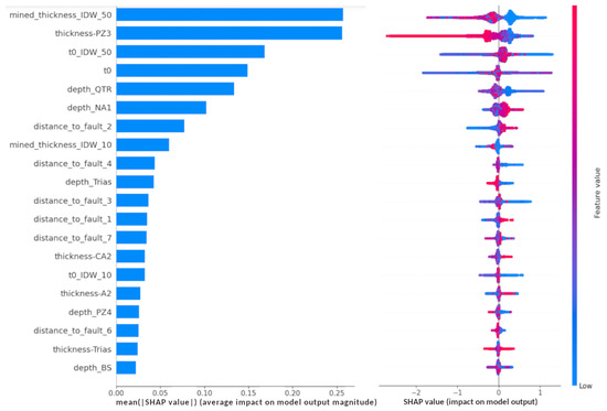 The highest average SHAP values for the model were assigned to the mined_thickness_ IDW_50 and thickness_layer_PZ3 parameters (∼0.25). The bee swarm chart shows that, in both cases, high values of the two parameters negatively influence the predictions of the model, i.e., they mean higher subsidence rates. Interestingly, layer_PZ3 is not located directly above the mining site, but rather an average of 186 m above it. This result is consistent with the assumptions based on the rock mass mechanics in the area, as these layers are subject to deflection and the overlying layers follow this deflection.