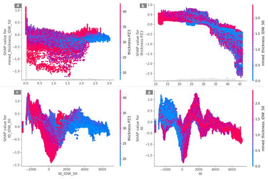 Relationship diagram of the four (a—mined_thickness_IDW_50, b—thickness_layer_PZ3, c—t0_IDW_50, d—t0) most significant parameters (x-axis) and their SHAP values (y-axis), i.e., their influence on the model predictions. An additional color is used to indicate the parameter with which they form the strongest interaction.