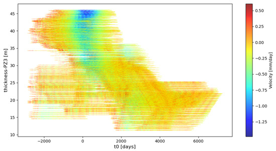 Relationship of subsidence velocity (color) to time to end of mining in the successive exploitation parcels of the deposit (x-axis) and spatially averaged (IDW 50 points) mine thickness (y-axis).