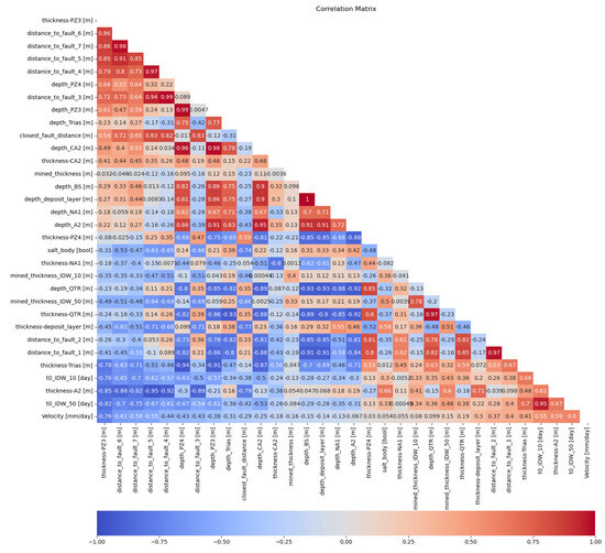The results obtained in this way were used as a target for ML models. In parallel with the SAR data calculations, feature engineering of geological-mining data was performed, which is a standard approach when preparing data for models to be used in ML. This procedure included, among other things: (1) normalization of the data, (2) calculation of the thickness of the geological layers (Figure 6), (3) calculation of distances to faults, (4) spatial averaging of the geological and mining data, and (5) calculation of parameters related to mining time. The data prepared in this way were used to: (I) to check their correlation with subsidence velocity and (II) to build a ML model whose purpose was to forecast subsidence velocity.