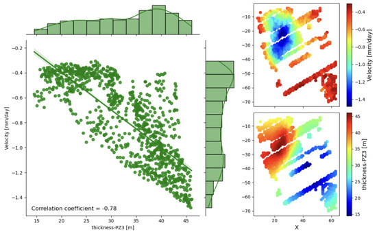 Comparison of the spatial distribution of the highest subsidence velocities (top) to the thickness of geological layer_PZ3 (left). (bottom): correlation of the highest subsidence velocities to the thickness of geological layer_PZ3. Correlation coefficient = −0.76.