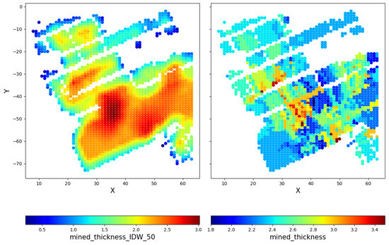 In the case of the mined thickness, the correlation presented in Figure 17 is not as obvious as the correlation for the layer_PZ3 thickness shown in Figure 8.