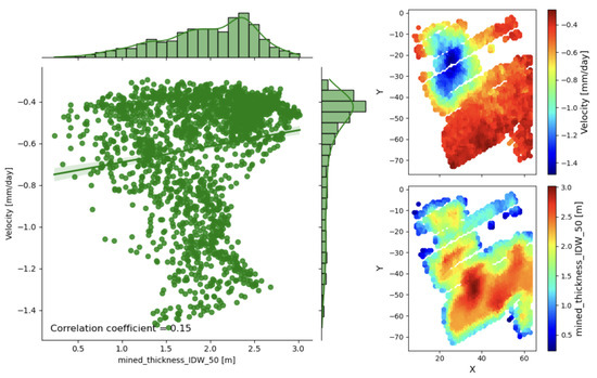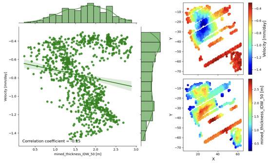 Comparison of the spatial distribution of the highest subsidence velocities (top) to the spatially averaged (IDW 50 points) thickness of the excavation (left) after elimination of measurement points for which mining took place before the collection of the first InSAR data (end of 2014). (bottom): relationship between the highest subsidence velocity (y-axis) and the spatially averaged (IDW 50 points) thickness of the excavation (x-axis) after elimination of measurement points for which exploitation took place before the collection of the first InSAR data (end of 2014).