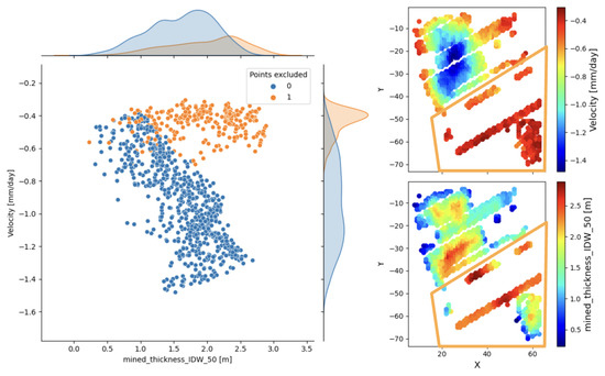 The relationship of the highest subsidence velocities (y-axis) (top) to the spatially averaged (IDW 50 points) thickness of the excavation (x-axis) (left) after elimination of measurement points for which mining occurred before the collection of the first InSAR data (end of 2014) (bottom). Points from the southern area are marked in orange on the cross plot and marked on the map with an orange rectangle.