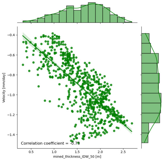 The correlation coefficient for the pair “highest rate −thickness_layer_PZ3” is −0.76, and this is the highest absolute value among all the subsidence rate pairs. This result is consistent with the machine learning model in which the thickness of layer_PZ3 has the greatest impact on the predictions. However, the correlation coefficient of the mined thickness parameter (mined_thickness_IDW_50—spatially averaged) is very low (+0.15), also lower than many other parameters. This fact may indicate that the model was able to detect a nonlinear dependence of this parameter on the target function or that the parameter is not significant for the point in time with the highest subsidence rates. Therefore, further investigations focused in more detail on the following two parameters: thickness_layer_PZ3 and mined_thickness_IDW_50.