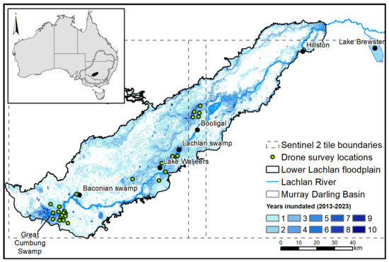 The location of the lower Lachlan floodplain within the Murray–Darling Basin. The map shows the number of times the area was inundated over a 10-year period (July 2013–June 2023). The locations of the drone imagery sites are indicated by green circles.