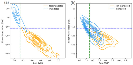 Contour plots showing the density of observations at inundated and non-inundated sites under sparse cover pixels (a) and vegetated pixels (b) with selected thresholds for FWI and Sum SWIR indices.