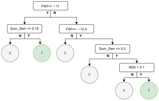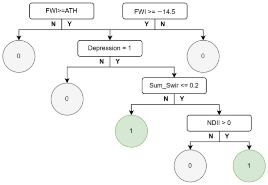 To overcome this, we combined mapped wetland depressions with FWI using a local adaptive threshold (ATH) approach. Local thresholds were obtained by calculating the weighted sum of values in a 21 × 21 pixel neighbourhood, with a Gaussian function determining the weights and applying a constant scaling factor of −8; this was implemented using OpenCV, version 4.8.0 [53]. To reduce the potential for commission errors, only pixels that were within a mapped wetland depression and had spectral characteristics suggestive of elevated moisture levels (either low Sum SWIR or elevated NDII) were considered as an inundated mixed pixel (Figure 6). We found that in woodland areas, this approach can misclassify tree shadows as mixed pixels. To mitigate this issue, we combined the areas detected as water and mixed pixels together and removed any mixed pixels that form isolated patches ≤ 3 pixels in size.