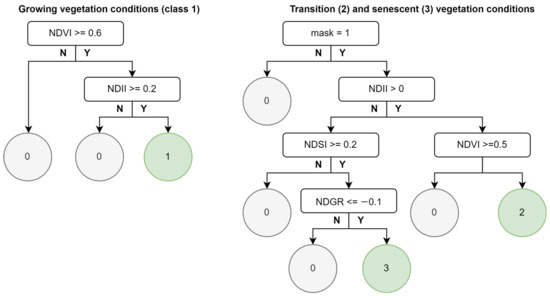 To identify senescent wetland vegetation or wetland vegetation in transition (senescing or green up), we counted the frequency of pixels that were classified as wet vegetation during the previous growing season. This involved analysing the images with <30% cloud cover between November and February (inclusive). This frequency map was converted to a binary growing season mask (maskgrow), with frequencies greater than 3 assigned to a value of 1. Pixels will only be considered in transition or senescent if they were within this mask, as the wetland vegetation must have been present during the growing season for it to transition to a senescent state. Wetland vegetation in transition was determined as having moderate NDVI values and positive NDII values. The identification of senescent vegetation combined three indices to minimise the potential misclassification of bare soil as senescent vegetation. NDSI has been used previously to identify crop residue [43] and we found that values greater than 0.2 tend to be more indicative of senescent vegetation than soil in wetland areas in the lower Lachlan. We also found that senescent vegetation tends to have lower green reflectance relative to red reflectance (the inverse of healthy vegetation) with negative values of NDGR indicative of senescent vegetation. Finally, in senescent vegetation NDII will typically be negative, while wet soil is more likely to have positive values so the inclusion of NDII helps to avoid misclassification of wet soils. While there is overlap with soil in each of these indices, combining the indices with the growing season mask as defined in Figure 7 aims to reduce misclassification of soil.