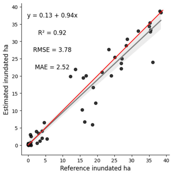 The AIM output was assessed at the plot scale by comparing reference inundation extents at each drone survey plot with the estimated inundation extent. The comparison, shown in Figure 8, demonstrates that inundation extent was slightly underestimated compared to the reference drone survey images, with a mean absolute error (MAE) of 2.5 ha and RMSE pf 3.8 ha. As seen in Figure 8, most surveys are centred near the trend line with a few distinct outliers. Removal of four sites with an absolute error greater than 8 ha reduces the MAE to 1.8 ha and RMSE to 2.6 ha. At three of these sites, omission of inundated areas was responsible for the large discrepancy to the reference inundated extent. The explanation of this discrepancy is discussed in the visual interpretation of results in Section 3.2.