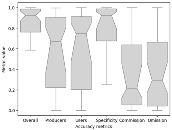 When assessing the accuracy metrics within each plot, overall accuracy and specificity remain high across all plots, while other accuracy metrics show considerable variability (Figure 9). The variability in producer’s and user’s accuracy is partially due to the proportion of the survey area that is inundated (Figure 10). Plots containing a low proportion of inundated pixels tend to accurately classify a high proportion of non-inundated (high specificity) while accurately classifying a lower number of inundated pixels (lower user’s accuracy values). The inverse is true for survey plots with a higher percentage of inundated pixels. This is likely because a large proportion of the minority class is mixed with the majority class (i.e., when a small number of inundated pixels surrounded by non-inundated pixels). The mixing of minority class pixels may mean they are spectrally similar to the adjacent majority class, resulting in a greater proportion of the minority class being misclassified. This results in a greater impact on omission and commission error rates, while overall accuracy remains consistent.