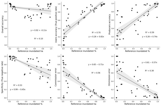 Relationship between accuracy metrics (y-axis) and drone survey plot inundation percentage (x-axis).