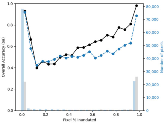 Overall accuracy (black line) based on subpixel percentage inundation as measured from high-resolution drone data for sparse cover pixels (black) and vegetated pixels (blue). Data are calculated by binning inundation percent to equal interval categories. The number of pixels evaluated in each bin is shown in grey for sparse cover and light blue for vegetated cover.