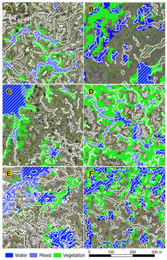 Examples of inundated features (white hatched polygons) over inundated classes from the AIM classification product and drone captured imagery as the underlying image. These examples highlight areas of significant errors of omission (A,C,E) and commission (B,D,F).