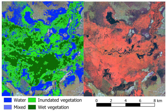 Commission errors overestimate inundation extent. These errors are higher for vegetated pixels relative to sparsely covered ones (Table 3). Examples of these errors can be seen in the right-hand column panels in Figure 13B,D,F. Misclassified inundated vegetation is often found adjacent to inundated depressions and channels that are identified as inundated. As the relief in these areas are low, these areas of vegetation have an elevation at or below the height of nearby water pixels.