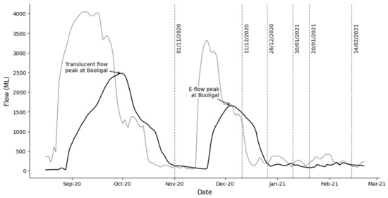 River flow data obtained from Water NSW (www.realtimedata.waternsw.com.au, accessed on 12 June 2024) at Hillston weir (grey) and Booligal (black) with translucent and environmental flow (e-flow) pulses labelled. Vertical dashed lines show dates mapped using AIM.