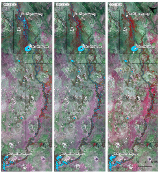Time series showing the progression of inundation from environmental water delivery down the lower Lachlan River between 11 December 2020–10 December 2021. Light-blue colours indicate areas detected as inundated using AIM. Box A highlights the area above Lake Waljeers, while box C highlights the Baconian Swamp that is upstream from the Great Cumbung Swamp. Box B highlights the area between these two regions.