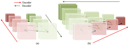In the existing models for processing segmentation tasks, most networks are based on the UNet [] architecture. As illustrated in Figure 1a, the network primarily consists of an encoding stage and a decoding stage. During the encoding phase, the convolution or transformer method is usually used, to extract features from high resolution to low resolution. In the decoding phase, there are multiple direct connections linking the encoder and the decoder. These connections facilitate the direct transfer of feature maps from each encoder layer to its corresponding layer in the decoder, aiding in the restoration of high-resolution details and enhancing the segmentation effectiveness. In addition, dilated convolution [] and pooling operations [] are utilized to expand the encoder’s receptive field for deep information.
